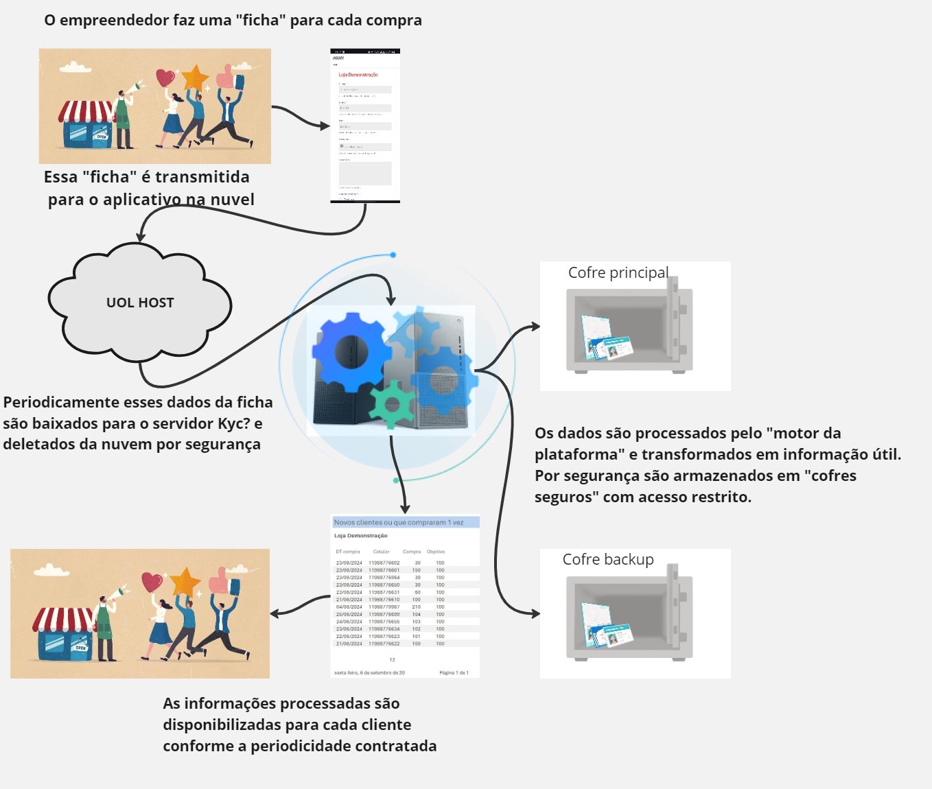 A plataforma Kyc? é composta de um aplicativo na nuvem (provedor UOL Host) e um motor de processamento em backoffice, os dados são armazenados em 2 cofres seguros com acesso restrito, o principal onde os dados são trabalhados e um segundo de backup onde os dados são uma cópia atualizada.